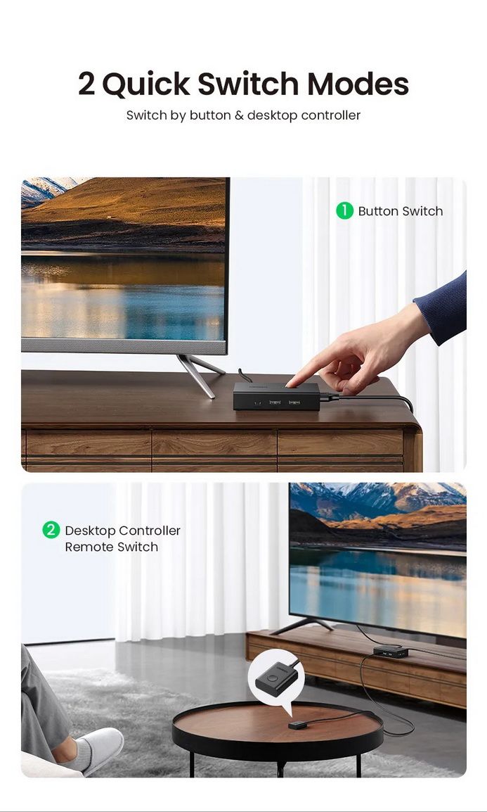 Hai chế độ chuyển đổi, sử dụng công tắc một nút hoặc bộ điều khiển máy tính để bàn, tự do chuyển đổi giữa 2 máy tính, tiết kiệm không gian trên máy tính để bàn của bạn và sử dụng màn hình, bàn phím và chuột yêu thích của bạn với cả hai máy tính, tăng năng suất của bạn trong văn phòng hoặc ở nhà.