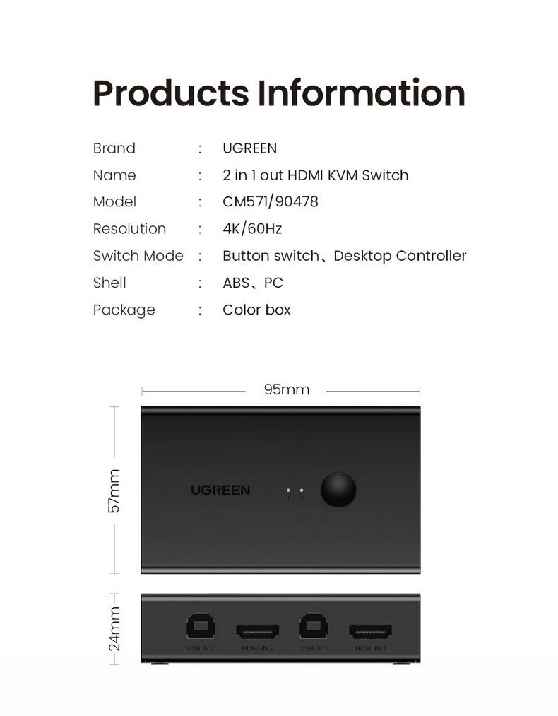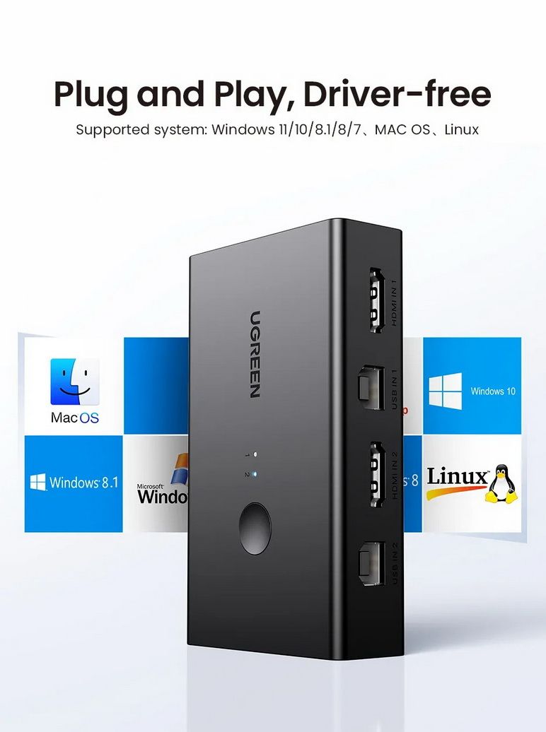 KVM Ugreen 90478 này tương thích với hầu hết các thiết bị USB và hỗ trợ các hệ thống Windows 10/8/8.1/7/Vista/XP, Mac OS và Linux. Bộ chuyển đổi 2 cổng HDMI KVM này cũng tương thích với hầu hết các thiết bị nguồn HDMI, tương thích với PS5, PS4, PS3, Xbox One, TV Box, PC, Laptop, Nintendo Switch, v.v.