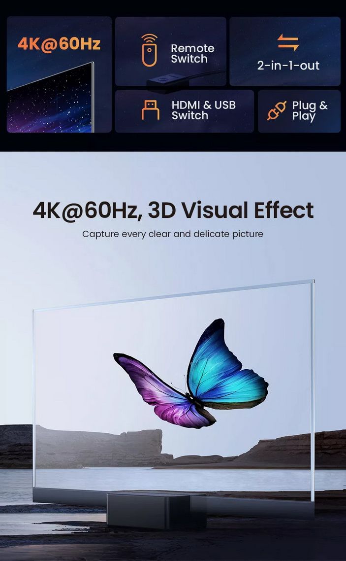 Bộ chuyển đổi HDMI USB KVM Ugreen 90478 này hỗ trợ độ phân giải lên tới 4K@30Hz, 2560*1440@120Hz,1920*1080@240Hz. Switch UGREEN KVM còn hỗ trợ HDMI 2.0, HDCP2.2/1.4, USB 2.0, 3D và HDR giúp hình ảnh hiển thị tinh tế và chân thực hơn, màu sắc tươi sáng và chuyển động hơn, thực sự mang đến một bữa tiệc mãn nhãn cho bạn.