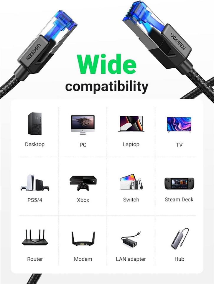 Ugreen 80429 Cáp mạng CAT8 tương thích hoàn hảo với máy tính, máy tính xách tay, modem, bộ định tuyến, PS5, PS4, PS3, X-Box 360, X-Box One, Switch, bộ chuyển mạch mạng, ADSL, bộ điều hợp mạng, hub và các thiết bị mạng khác. Nó cũng có thể tương thích ngược hoàn toàn với Cat7, Cat6e, Cat6, Cat5e, Cat5.