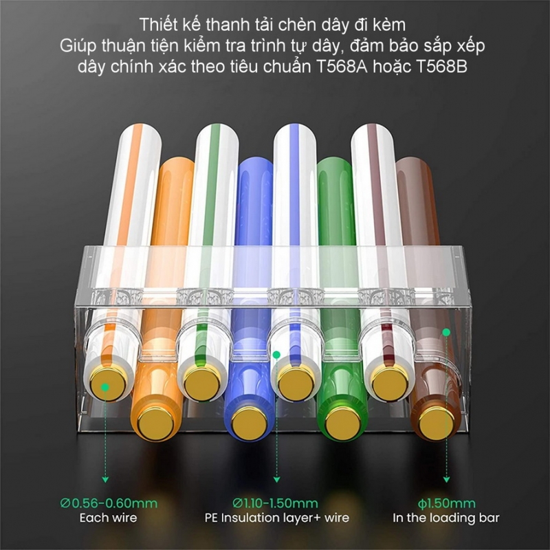 Đầu cắm RJ45 được bọc inox chuẩn đầu nối dây 8P8C tốc độ đạt 10Gbps, truyền dữ liệu cao với tín hiệu ổn định