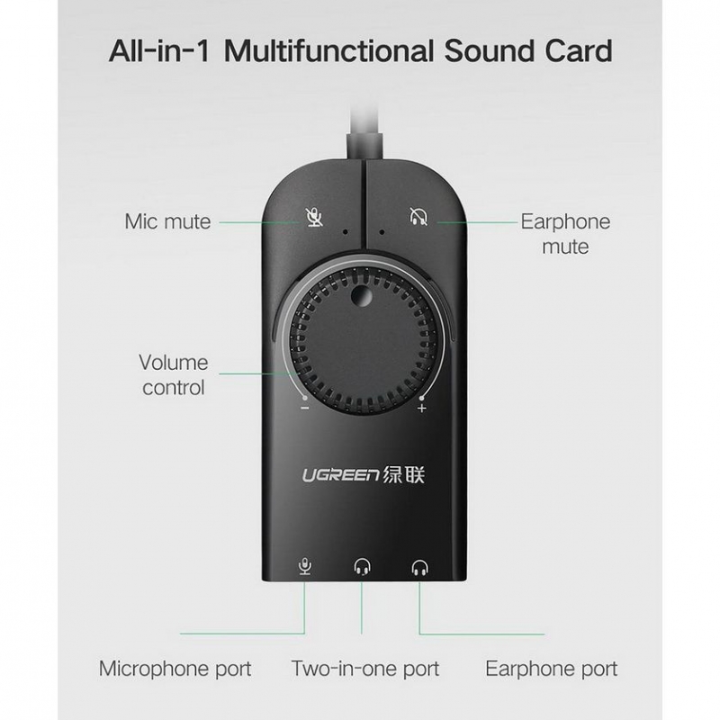 - Card Âm Thanh USB Ugreen 40964 được thiết kế nhỏ gọn tinh tế, tích hợp các phím điều khiển như bật/tắt Micro phone, bật/tắt âm thanh, công tắt điều chỉnh âm lượng giúp bạn dễ dàng điều khiển nhanh âm thanh ngay trên thiết bị. Điểm đặc biệt là Ugreen 40964 hỗ trợ đến 3 cổng output bao gồm: 1 cổng Âm thanh, 1 cổng Mic, và 1 cổng tích hợp cả âm thanh và mic chuyên dùng cho tay nghe điện thoại (các loại tay nghe 1 dây có mic), điều này mang đến sự thuận tiện và tương thích tối đa với các tay nghe và loa của bạn.