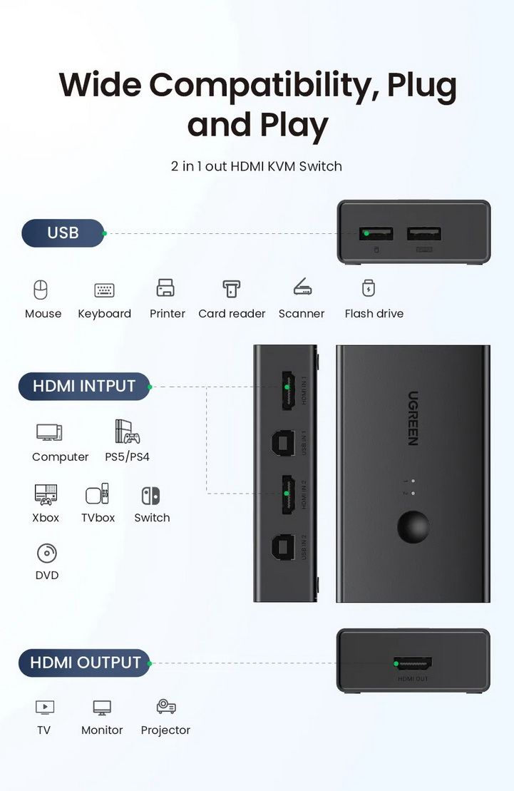 KVM Ugreen 90478 này tương thích với hầu hết các thiết bị USB và hỗ trợ các hệ thống Windows 10/8/8.1/7/Vista/XP, Mac OS và Linux. Bộ chuyển đổi 2 cổng HDMI KVM này cũng tương thích với hầu hết các thiết bị nguồn HDMI, tương thích với PS5, PS4, PS3, Xbox One, TV Box, PC, Laptop, Nintendo Switch, v.v.