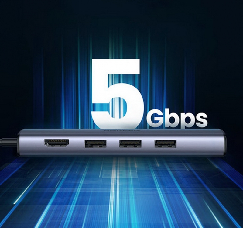 - Cáp chuyển USB-C 5 trong 1 Ugreen 20934 còn trang bị thêm 3 cổng USB 3.0 giúp bạn kết nối các thiết bị ngoại vi, và các thiết bị lưu trữ truyền tải dữ liệu tốc độ cao lên tới 5Gbps
