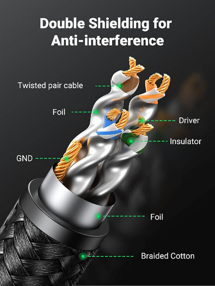 Ugreen 80429 được thiết kế với 4 cặp xoắn được bọc kim loại (F/FTP) và một lớp che chắn bằng lá nhôm. Thiết kế này có thể làm giảm đáng kể nhiễu và nhiễu xuyên âm từ các cặp cáp liền kề và các loại cáp khác, giúp tốc độ mạng nhanh hơn và ổn định hơn.